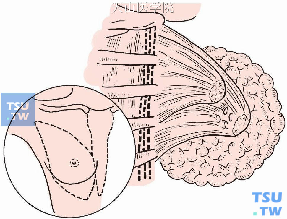 手术指征乳房导管内乳头状瘤。术前准备同本章第二节“乳房肿块切除术”。麻醉局部浸润麻醉或静脉麻醉。体位仰卧位。手术步骤若表面能触及肿块,即在肿块表面做放射